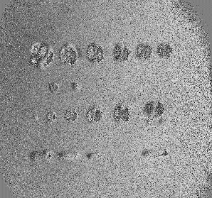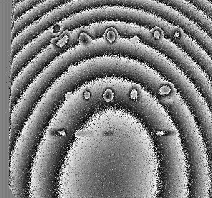 Bonding Flaw Inspection with Holography and Shearography. The object here is a ceramic plate with a layer of plastic bonded to it by a double-sided adhesive layer. Flaws were cut in the adhesive layer to generate disbonds of various sizes and shapes. A thermal stress was applied to the structure to generate deformation of the plastic where it was not bonded to the ceramic. Vacuum stressing could also be used, and, for materials that conduct sound well, ultrasonic noise can cause flaws to vibrate. The image on the left shows the flaws as revealed by holographic fringes. They appear as perturbations of the overall elliptical fringe pattern due to thermal deformation. The image on the right shows the flaws as revealed by shearography. The overall deformation fringes are not evident because the fringes here indicate values of constant slope. Shearography is more vibration tolerant but requires more laser light.