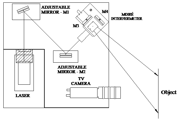 When the system is configured for Projected Fringe Moiré, laser light is directed into a shearing interferometer, which generates two interfering beams that form fringes that fan out to illuminate the object at an angle to the observation direction of the TV camera. The spatial frequency of the fringes is adjustable to any horizontal or vertical spacing, and one of the mirrors in the interferometer is mounted on a piezoelectric actuator. The fringes are given a quarter cycle displacement between TV frames so that they appear to sweep across the object.