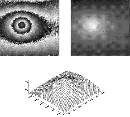 Expansion of Cardboard due to moisture. A sheet of thin cardboard was moistened on its back with a drop of water and compared to its profile before the wetting occurred. The fringe projection angle was calibrated to 45o and the fringe density was calibrated to 100 fringes across the horizontal image. Top left shows the wrapped phase fringes, displayed in real-time, of the deformation. Top right shows the fringe locus function obtained by unwrapping the fringes. The bottom image shows a 3D plot of the deformation. |