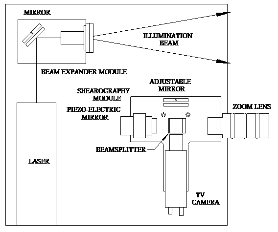 The heart of the system is an interferometer assembly, which is called the shearography module. This is, in effect, a Michelson interferometer through which an image of the object is relayed to the TV camera. The objective lens, which is a 6x TV zoom lens, forms an image of the object on a field lens. The interferometer consists of a cube beam-splitter and two mirrors, and two relay lenses are used for the image transfer, one at the input to the beamsplitter and one at its output.